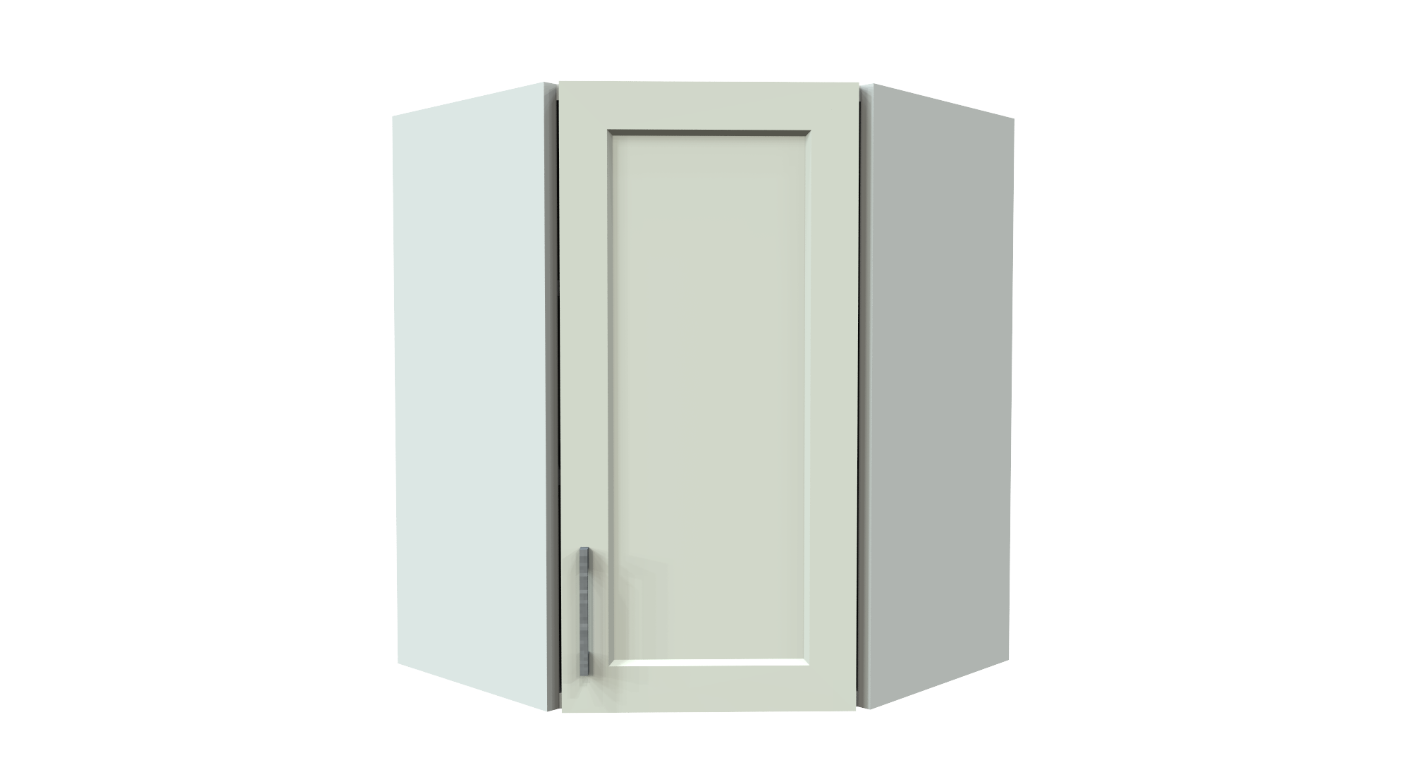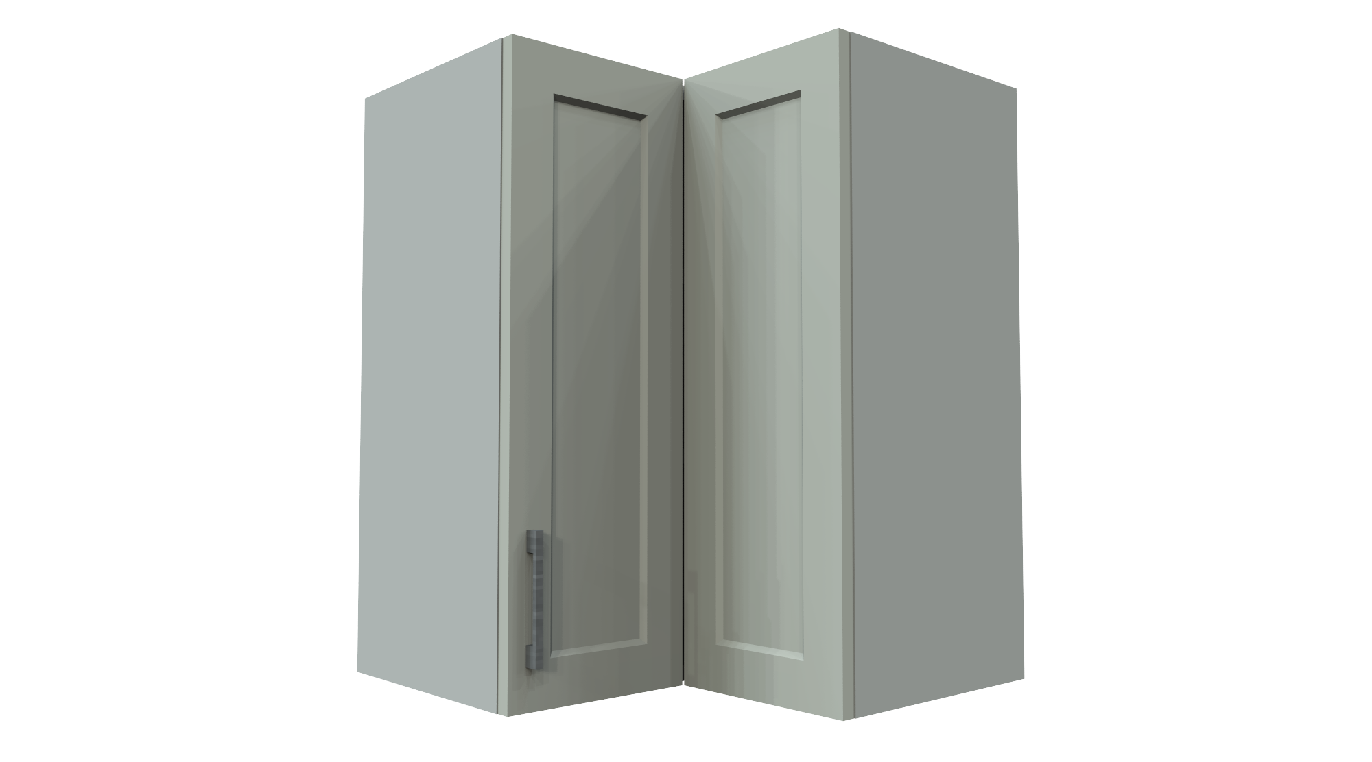 A functional corner cabinet designed to efficiently utilize corner space while maintaining accessibility and a seamless appearance within the wall cabinet layout.