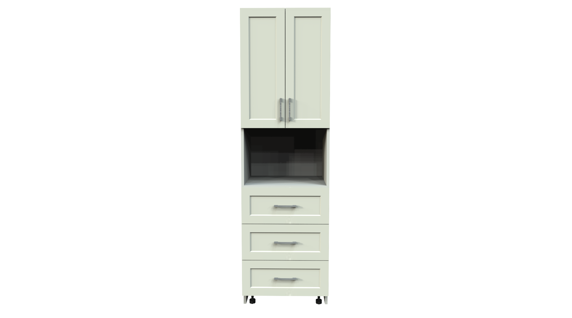 A functional and stylish tall cabinet designed to integrate a built-in microwave with convenient drawer storage below, offering both practicality and a seamless appearance.